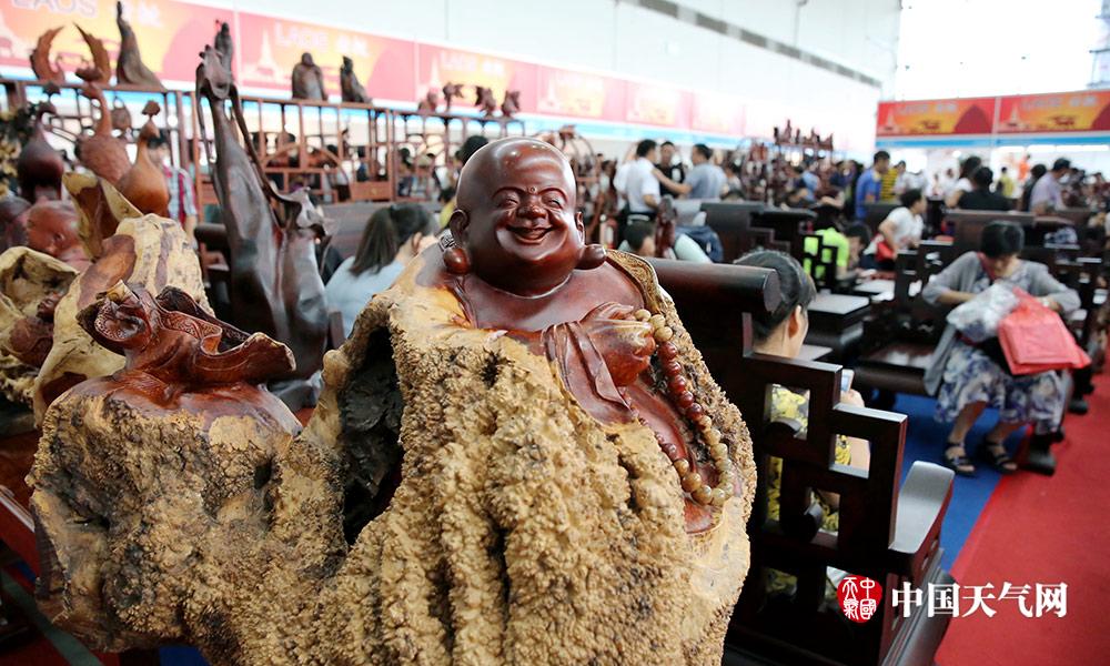 老挝馆里展示的红木家具及工艺品,做工精致,雕刻出的佛像和动物栩栩如生(摄影:刘英轶)