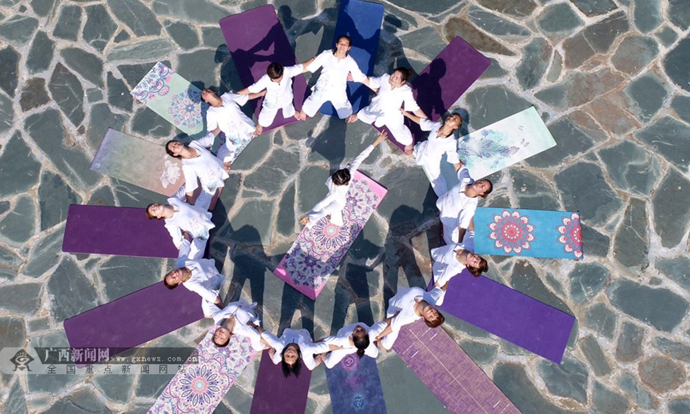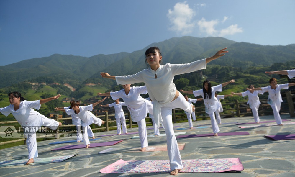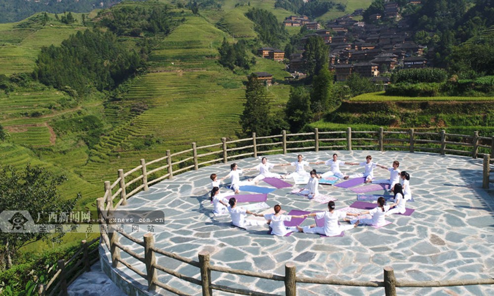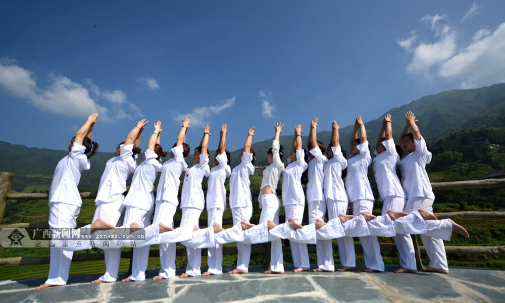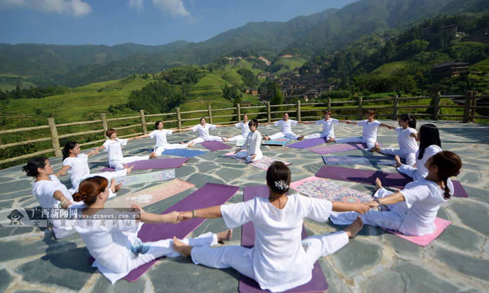 9月16日,在桂林市龙胜各族自治县龙脊梯田景区练习瑜伽的姑娘们。(摄影:潘志祥)