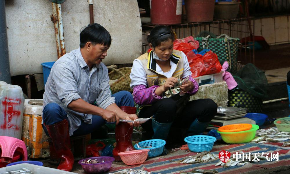 受冷空气影响,13日早防城港天气略寒凉,海鲜商贩们都换上了长袖衣服(摄影:林文桦)