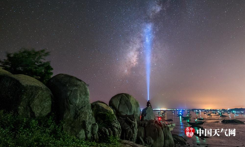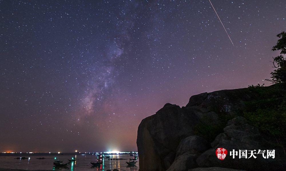 13日晚,钦州三娘湾景区天涯石上空现美丽的流星划过银河景观。(摄影:李斌喜)