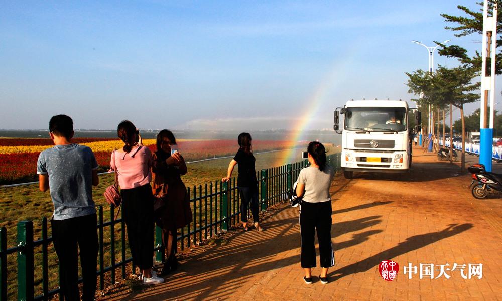 路旁给花圃浇水的洒水车造出的彩虹引游客纷纷与其合影。(摄影:卢威旭)