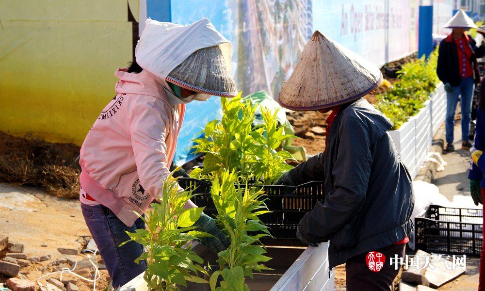 工人们将花草有序地放入木柜子中。(摄影:卢威旭)