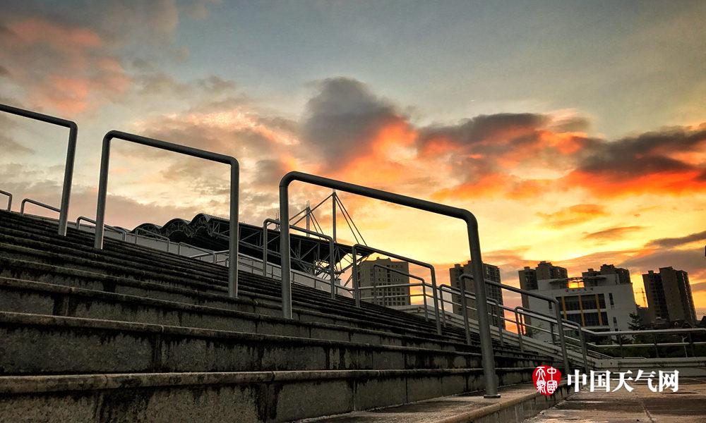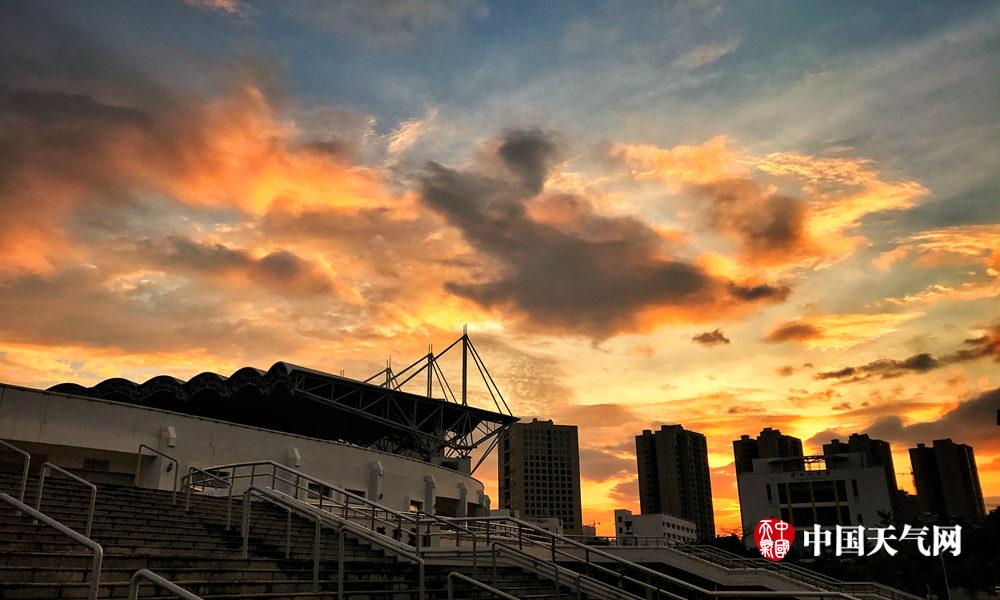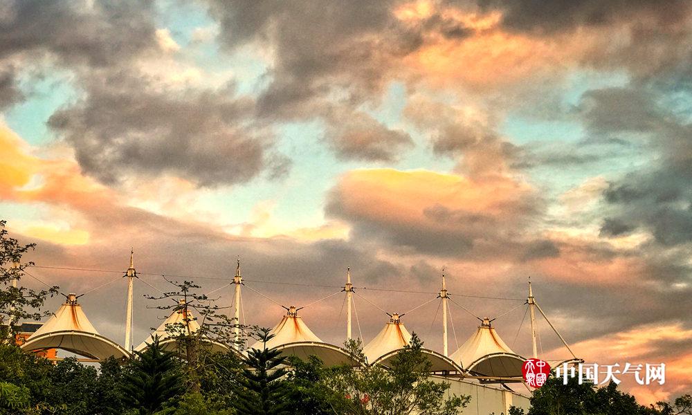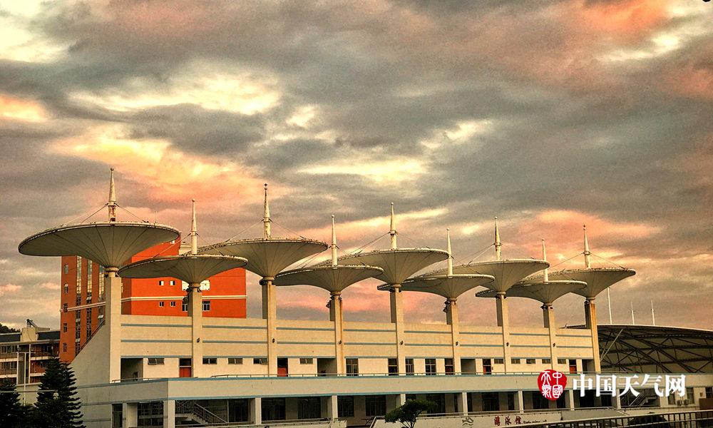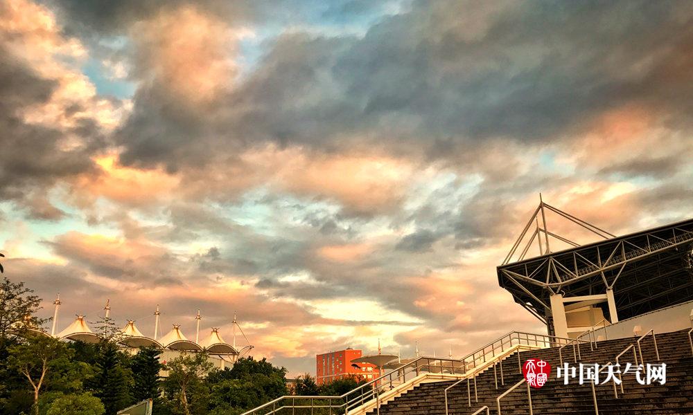 云霞飘浮下的体育中心(摄影:黄虫)