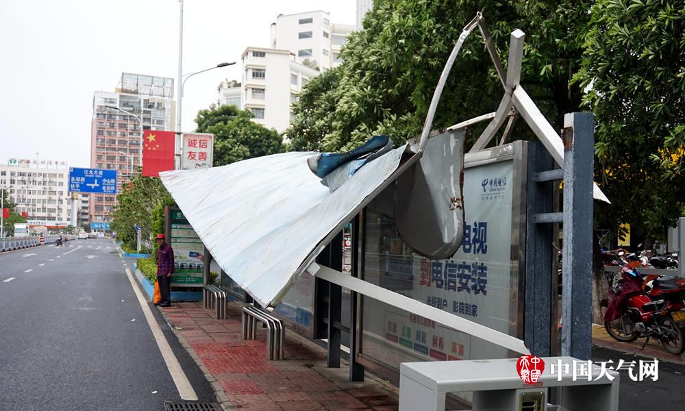 被吹塌的公交车站牌(摄影:李新华)