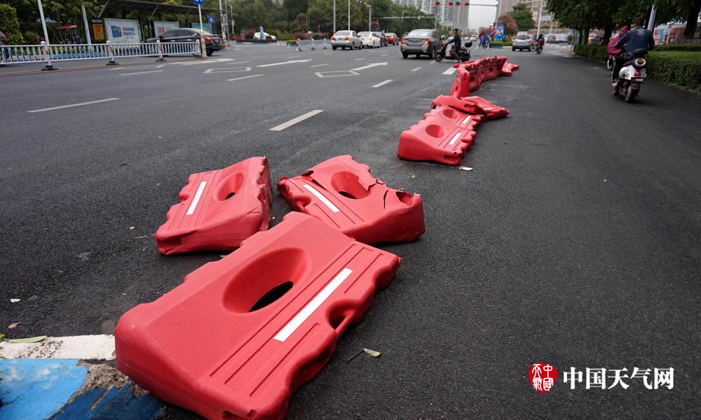 路上的隔离物被吹得七零八落(摄影:李新华)