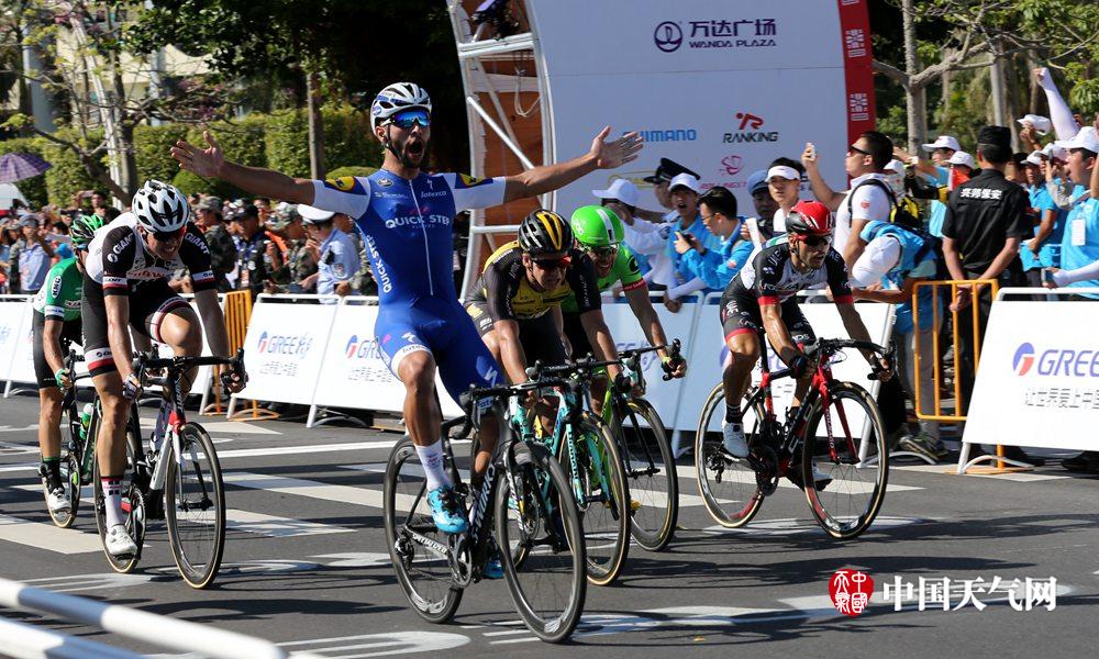赛段冠军、总成绩“格力”红衫、最佳年轻车手“李宁”白衫:快步车队加维利亚率先冲过终点(摄影:刘英轶)