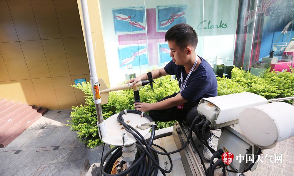 王玮,赛事期间主要负责应急移动气象车风速、风向、温度、气压、雨量等传感器的安装、维护和故障处理。图为王玮在安装应急车顶的风速、风向传感器。设备架设完毕之后,通过车内的数据采集器采集各个传感器数据,把实时数据传输到电脑,再通过电脑的数据采集软件把实时气象数据显示出来。(摄影:刘英轶)