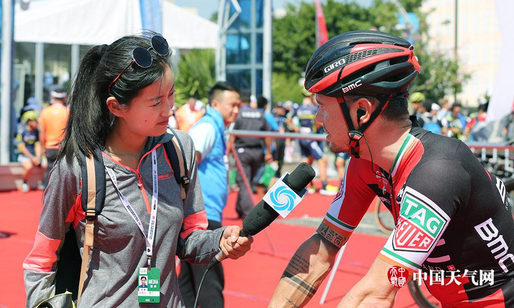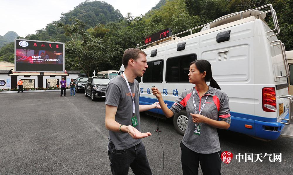 在第四赛段终点弄拉风景区,马山气象提供的天气预报信息在电子屏幕上循环播放。图为张娜采访了一位来自法国的专门报道自行车赛事记者Benoit,他说:“天气对于车手来说至关重要,不光会影响到比赛的成绩,有时甚至会关系到车手的安危。比如降雨会带走运动员的体温,因此他们要穿上防雨的衣服。不过最重要的是风,风速太大会阻碍车手前进,风向会打乱车队的队形,在高速骑行的状态下,如果刮起大风,是一件非常危险的事。车手们一般会通过网站,天气APP,或者组委会给他们提供的信息来了解比赛期间的天气预报,每次比赛前一晚、第二天都会关注。”因此,Benoit表示气象服务非常重要。(摄影:刘英轶)