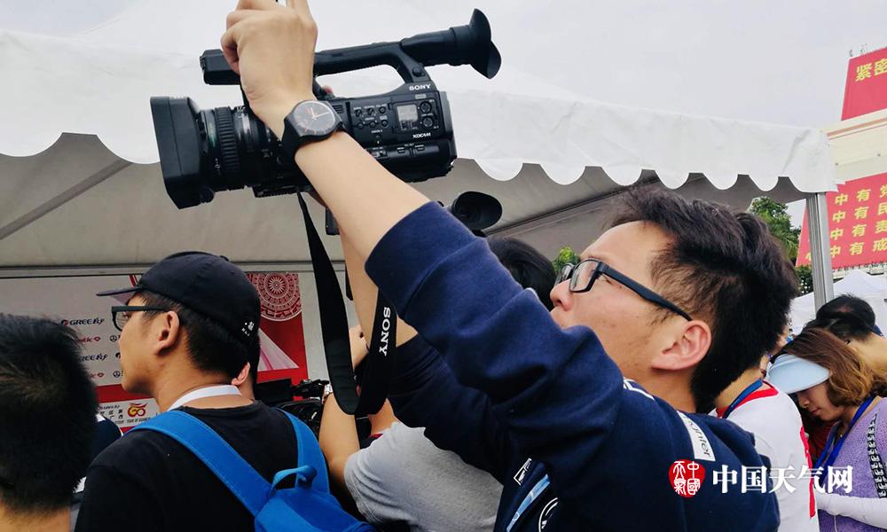 付发朝,中国气象频道广西站记者。主要负责比赛现场的视频拍摄和剪辑,并把编辑完成的视频回传至中国气象频道。由于比赛期间媒体记者和工作人员很多,为了拍到选手画面,有时需要长时间高举摄像机拍摄,拍摄完手都酸了;赛事行程紧凑,他经常顾不上吃饭,争分夺秒地制作新闻视频,只为了能第一时间回传播出(摄影:韩嘉乐)