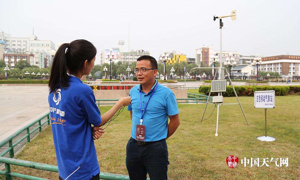 在最后一日桂林站比赛期间,桂林气象局在中心广场上架设了六要素的应急移动气象站,可观测温度、湿度、风向、风速、雨量和气压,给组委会提供现场实况信息。图为桂林气象局科技服务中心姚立宏向我们介绍现场气象保障服务工作(摄影:刘英轶)