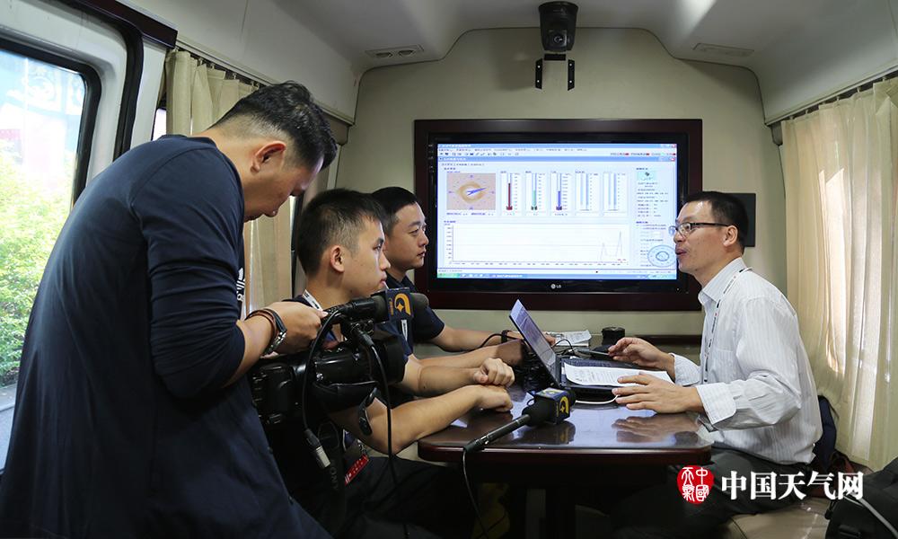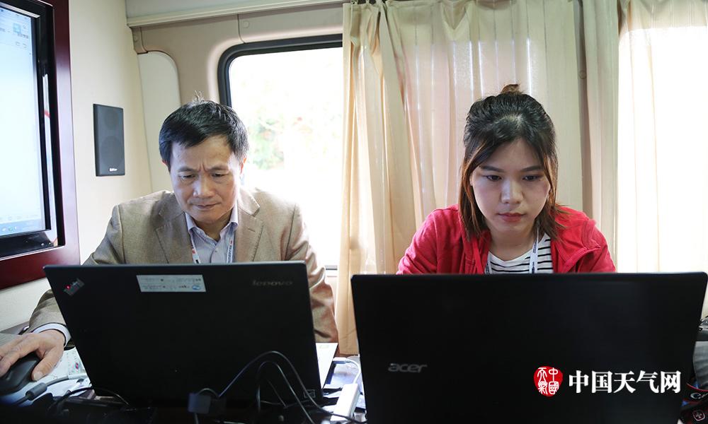 黄明策(右一),广西气象台副台长。图为黄明策在南宁绕圈赛开赛前向广西电视台新闻频道记者介绍应急移动气象台的功能及设备,并对赛事期间的天气情况做了预测预报(摄影:韩嘉乐)