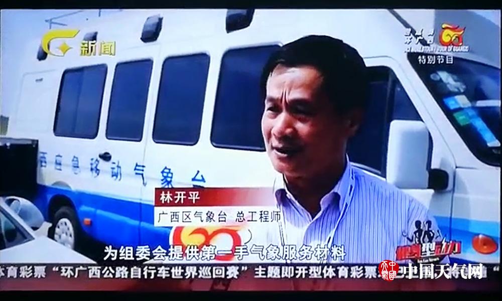 林开平,广西气象台总工程师。赛事期间,他每天都会根据广西气象台发布的“环广西”气象服务专报和最新的气象数据,为组委会提供赛场天气实况以及气象服务。图为林开平接受广西电视台新闻频道采访。
