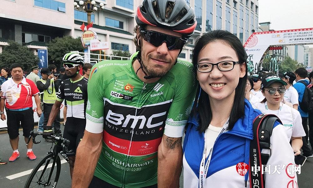 第六赛段桂林-阳朔-桂林比赛当天,车队亮相仪式过后,在赛道上我很幸运的和“世巡赛·环广西”的爬坡王,来自BMC车队的丹尼尔·奥斯合了张影(摄影:付发朝)