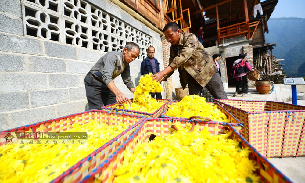 10月30日,在桂林市龙胜各族自治县泗水乡周家村,当地瑶族群众在分拣皇菊。(摄影:潘志祥)