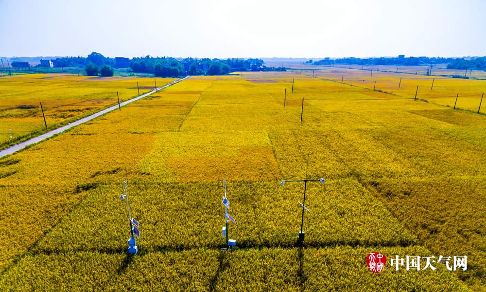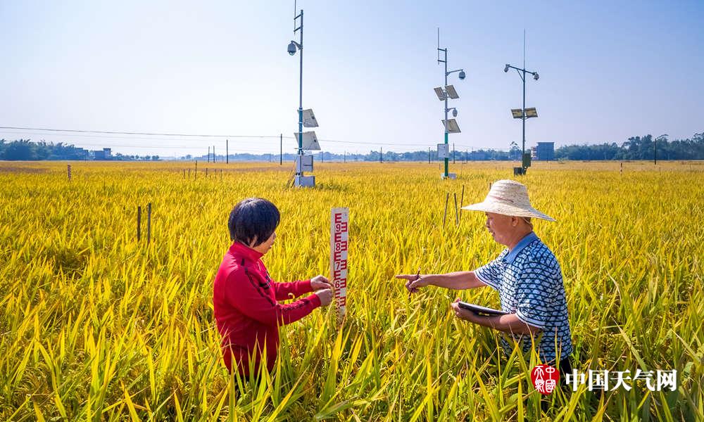 11月2日,广西钦州市康熙岭镇天气晴好,农气专家在当地的水稻自动化观测试点进行观测(摄影:李斌喜)