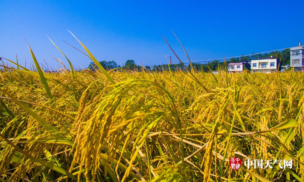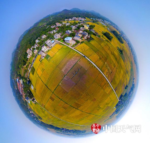 11月2日,广西钦州市康熙岭镇大面积晚稻已经成熟,田园一片美丽的丰收色彩(摄影:李斌喜)