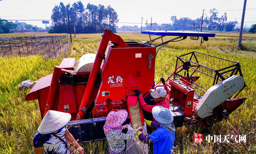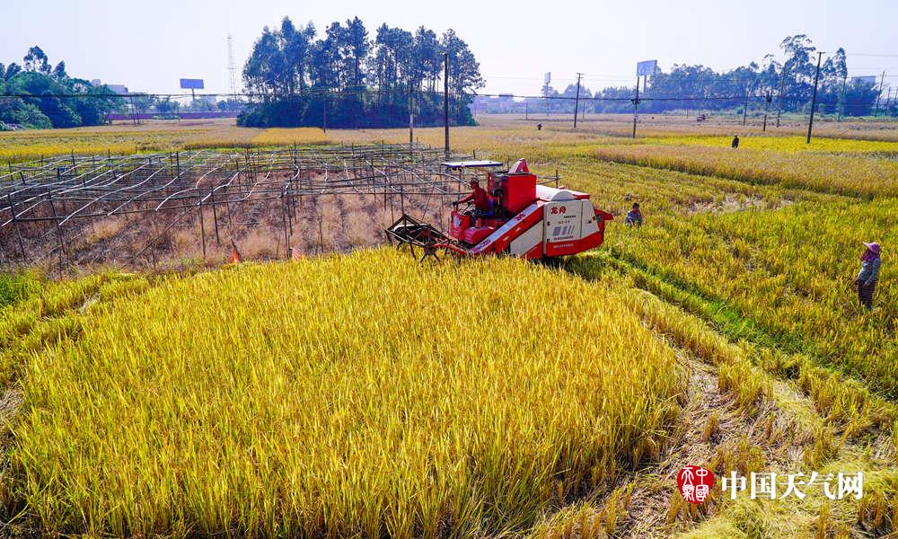 11月2日,趁着好天气,广西钦州市康熙岭镇的农民用收割机在收割晚稻(摄影:李斌喜)