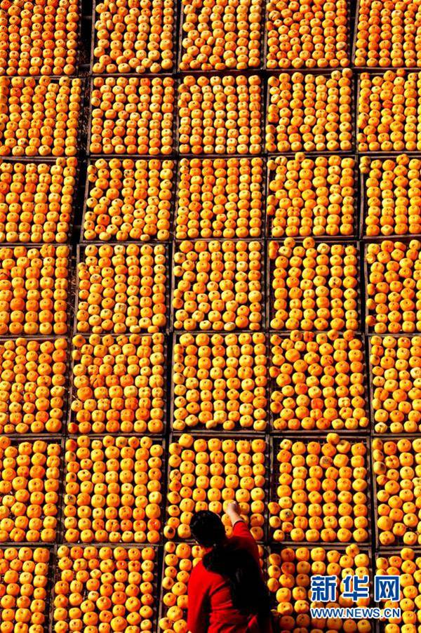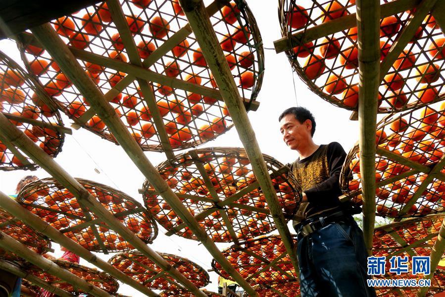 11月4日,广西恭城瑶族自治县莲花镇红岩村农民在晾晒柿子。