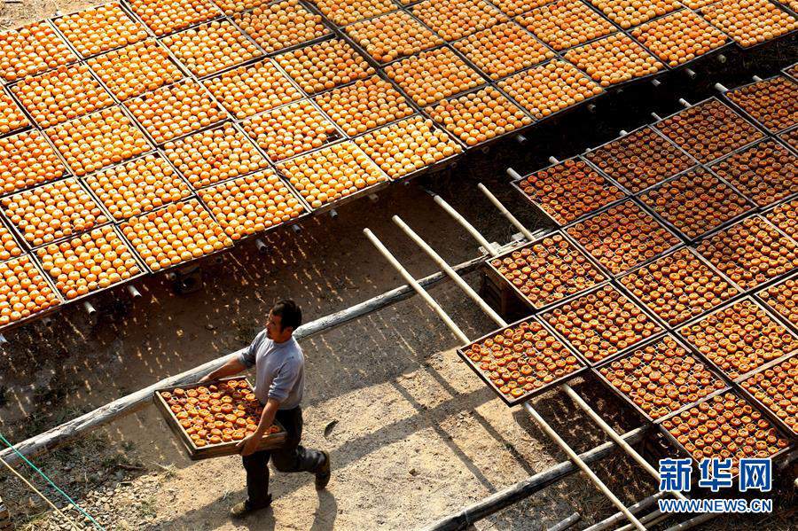 11月4日,广西恭城瑶族自治县栗木镇农民在晾晒柿子。