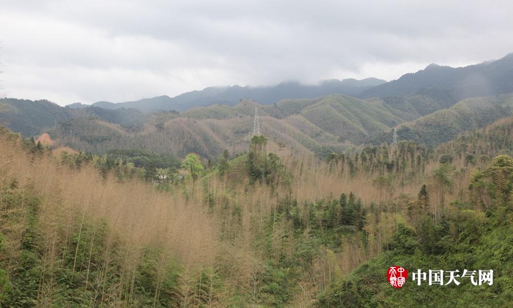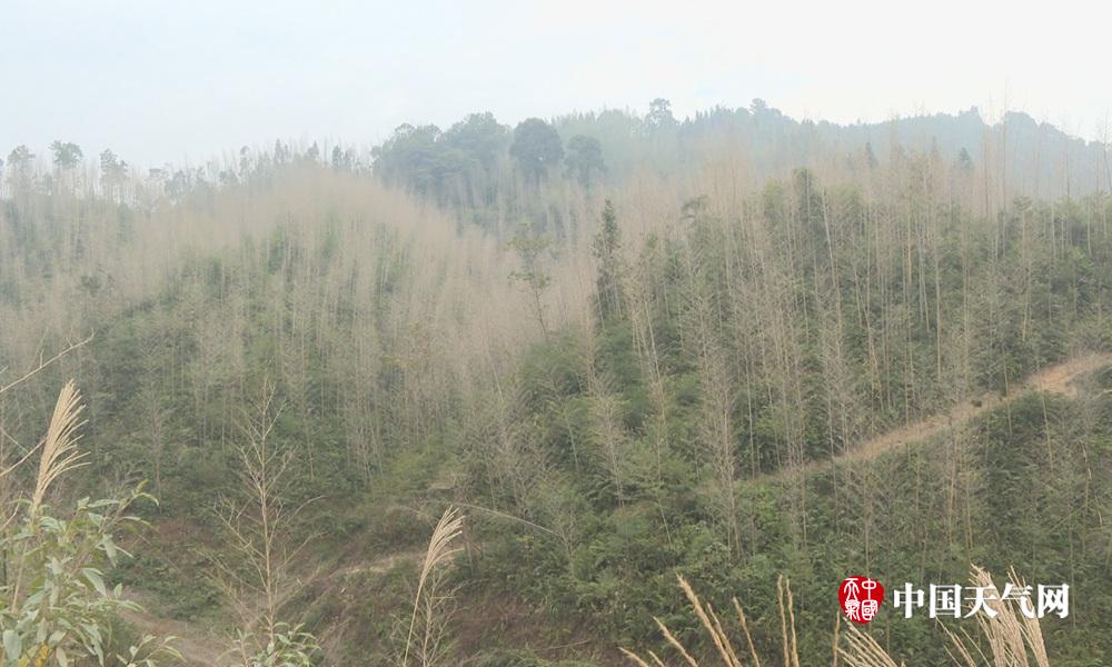 中国天气网广西站讯 受2016年冬半年~2017年9月气温持续偏高影响,广西林业有害生物发生严重,特别是桂北毛竹受竹蝗虫侵害达到了大爆发程度,农民损失严重。由于防治不够彻底,预计2018年仍将可能发生较严重灾情。在桂北山区,毛竹是山林中重要的经济林,山民依靠毛竹进行粗加工获得经济来源。(文:郭晓薇 摄影:付发朝)