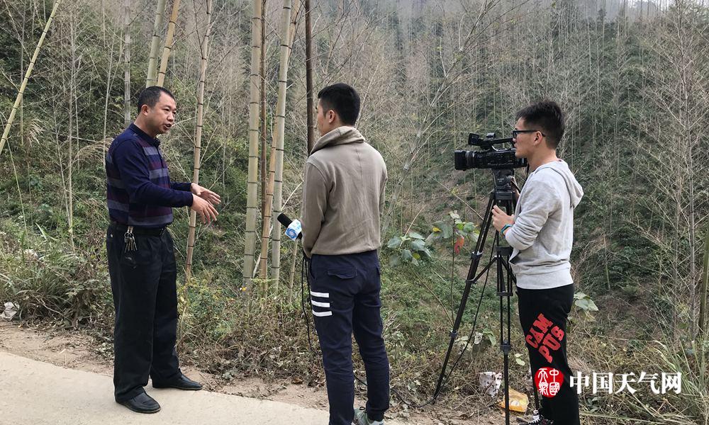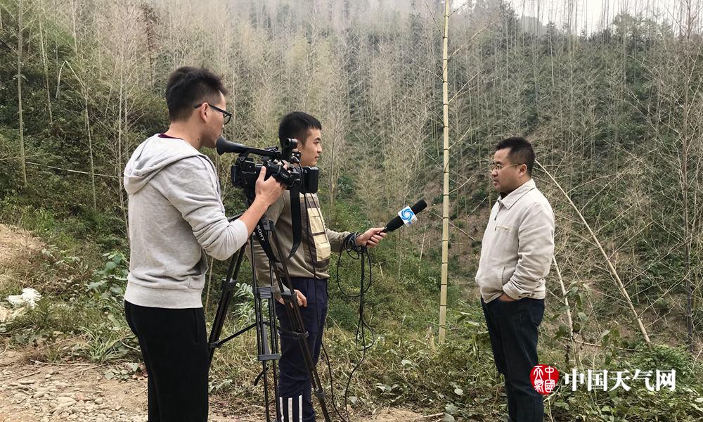 广西气象减灾研究所高工秦江林介绍:今年竹蝗发生是有比较特别的背景,2016年气温是整体偏高的,到了2017年1月份的时候整个桂东北地区的气温特别的高,高出三点几度,60年来排在了第一位,这是导致今年竹蝗大爆发的原因。图为广西气象减灾所秦江林高工针对病虫害发生气象原因接受中国气象频道记者实地采访(摄影:付发朝)