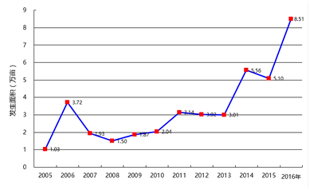 据桂林市林业局多年监测数据显示,2005年以来,今年确实是竹蝗虫发生最严重的一年。具体数据为:2005年发生1.03万亩、2006年发生3.72万亩、2007年发生1.93万亩、2008年发生1.50万亩、2009年发生1.97万亩、2010年发生2.04万亩、2011年发生3.24万亩、2012年发生3.02万亩、2013年发生3.01万亩、2014年发生5.56万亩、2015年发生5.10万亩、2016年发生8.51万亩、2017年14.08万亩。从竹蝗虫发生曲线图来看,跟全球变暖的气候实况是吻合的,2005年以来气候异常偏暖导致虫害发生基本呈现小幅度增长态势,直到2017年比2016年猛增至接近一倍,达到大爆发程度。图为黄脊竹蝗发生态势图。