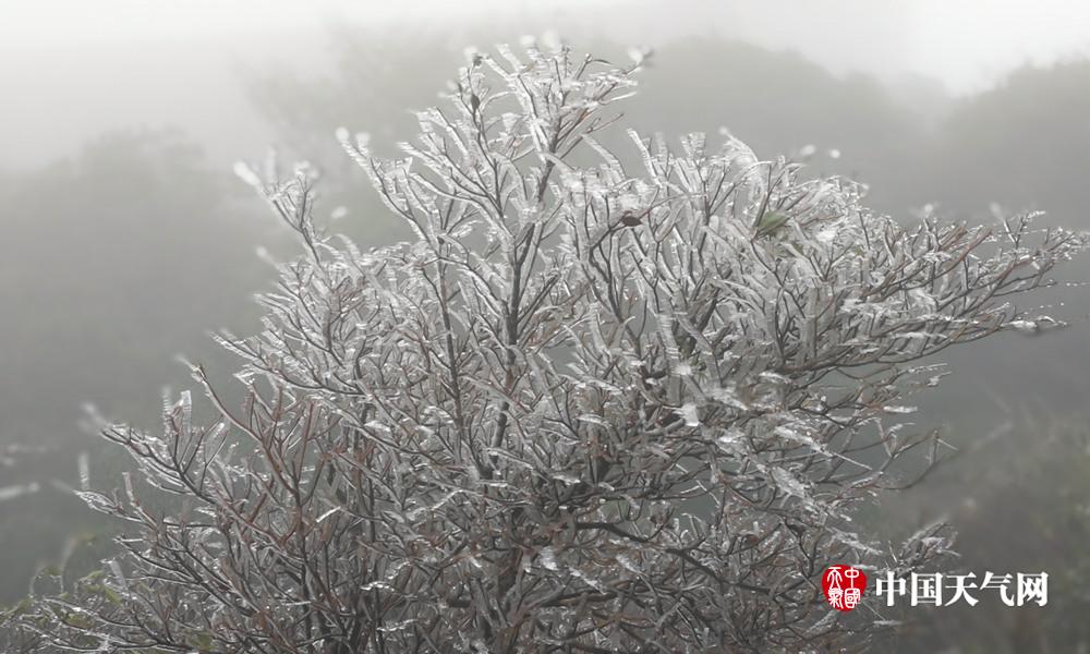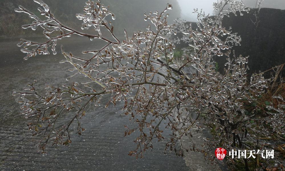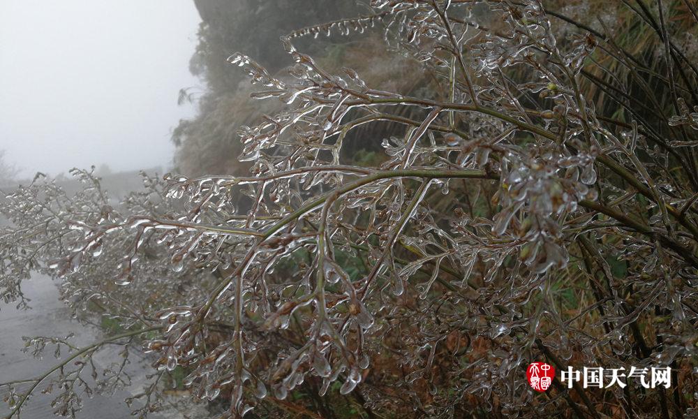 冻雨景观通常是在较为复杂的气象条件下形成。首先是出现在大雾的天气里,相对湿度较大,气温通常低于0℃,且风速较小。图为枝叶上挂满冰晶,银装素裹。(文/黄归兰 吴智君 图/李龙)