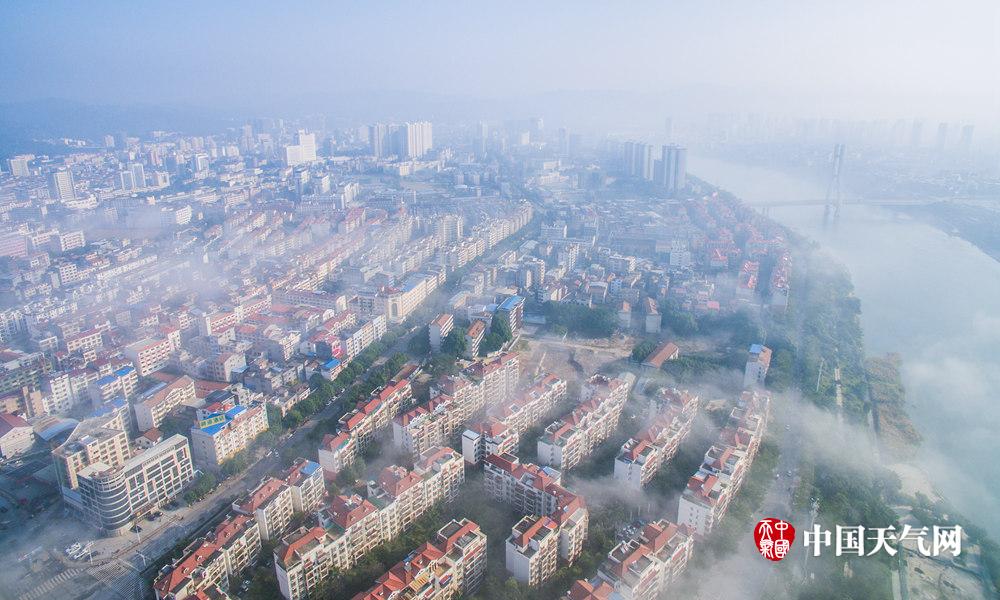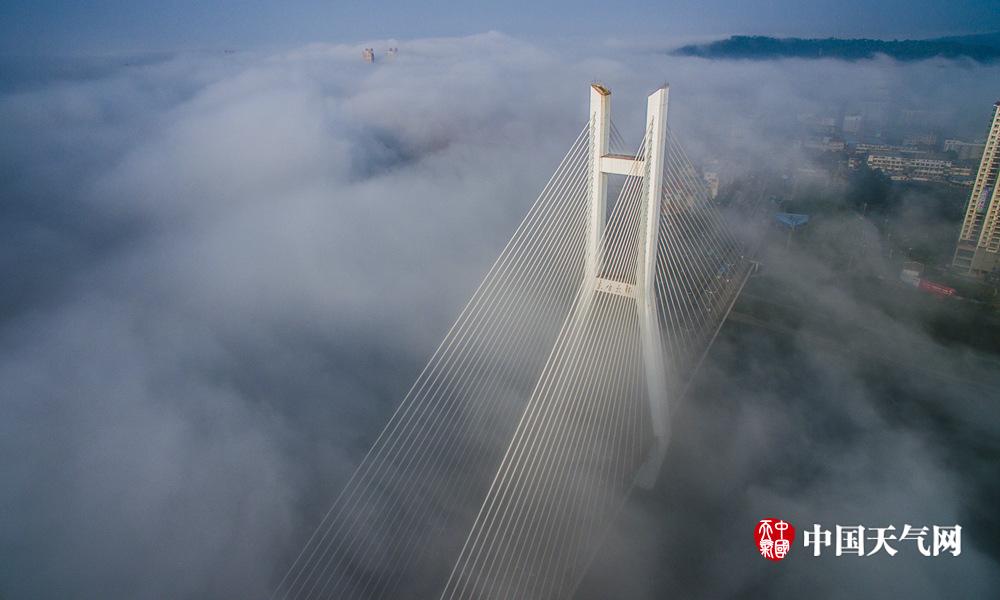 今天(28日)早上,广西百色市右江区笼罩在“仙气”中,从远处望去建筑物若隐若现,宛如仙境美不胜收。据百色市气象台介绍,此次大雾为辐射平流雾,因前晚上地面辐射降温达到凝结温度,经暖湿气流随空气流动遇上辐射降温的空气凝结成雾。(文/蒋健)图为屹立云雾的东合桥。(摄影:李明志)