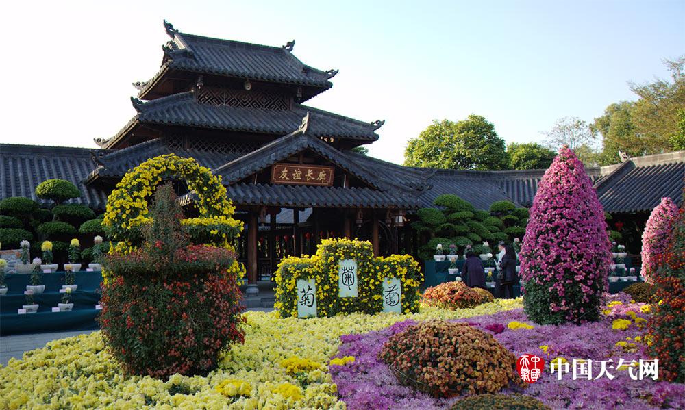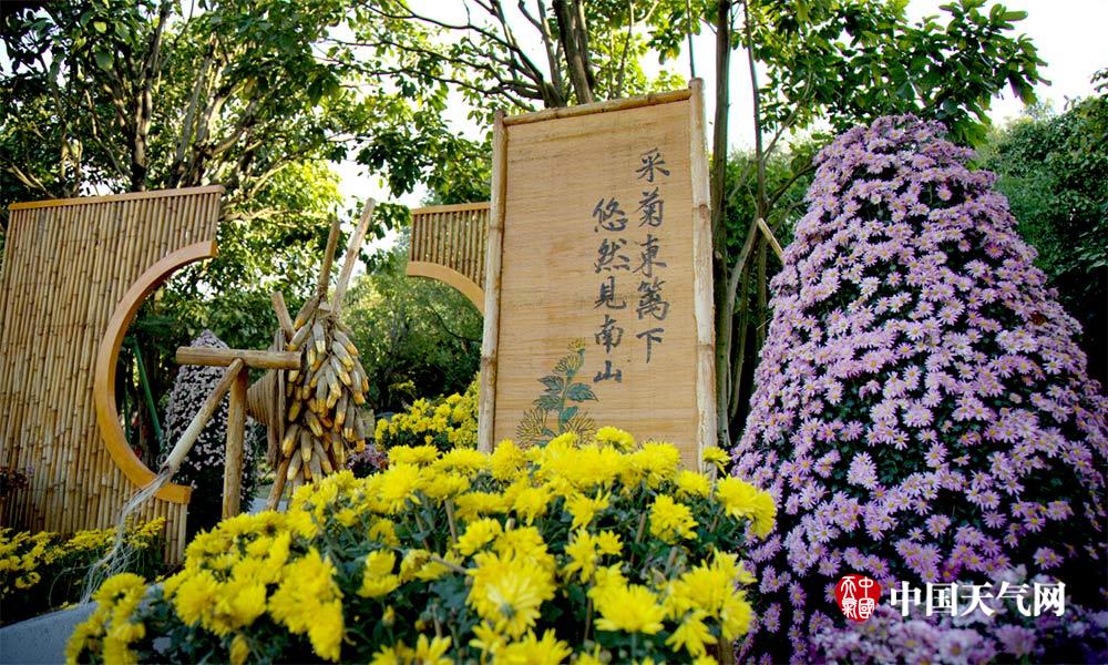 21日南宁阳光普照 菊花展以“颂菊”为主题,“诗文古韵”为主线,7组园林小品的形式展现菊花的美。图为《东篱咏菊》主题(摄影:刘英轶)