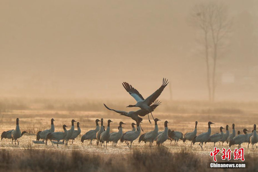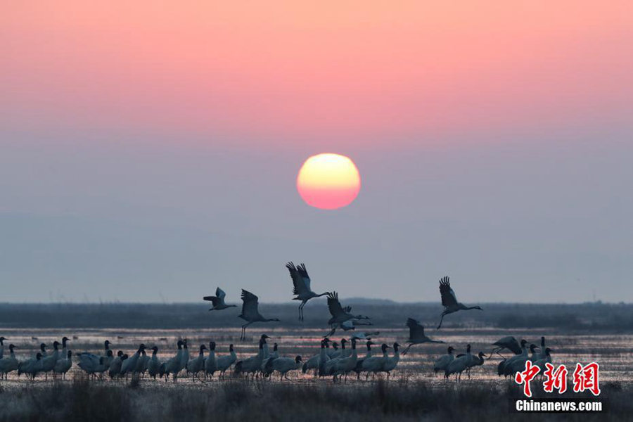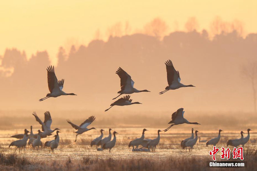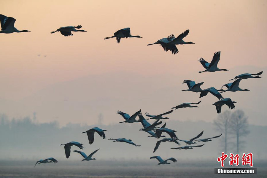 迎着朝霞飞出觅食的黑颈鹤。 中新社记者 贺俊怡 摄