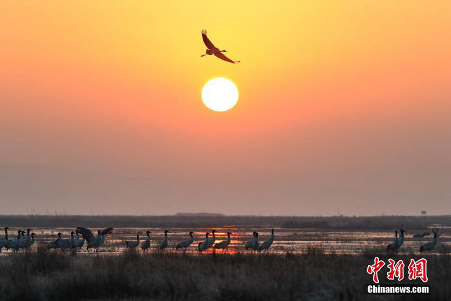 一只黑颈鹤迎着朝阳飞出觅食。 中新社记者 贺俊怡 摄