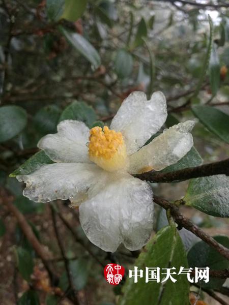 8日早上,柳州三江白云山上的树木被冰雪覆盖。(摄影:周林)