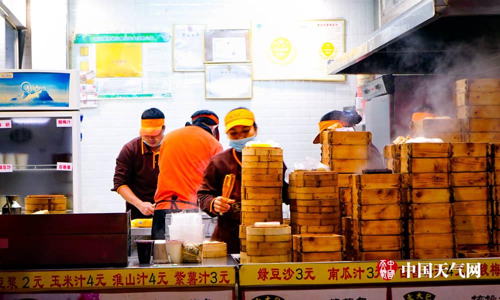 9日清晨,早餐店的工作人员端出热气腾腾的包子(摄影:李斌喜)