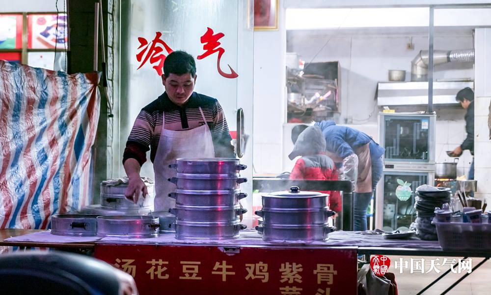 9日清晨,早餐店的工作人员在寒冷的清晨中准备热乎乎的早餐(摄影:李斌喜)