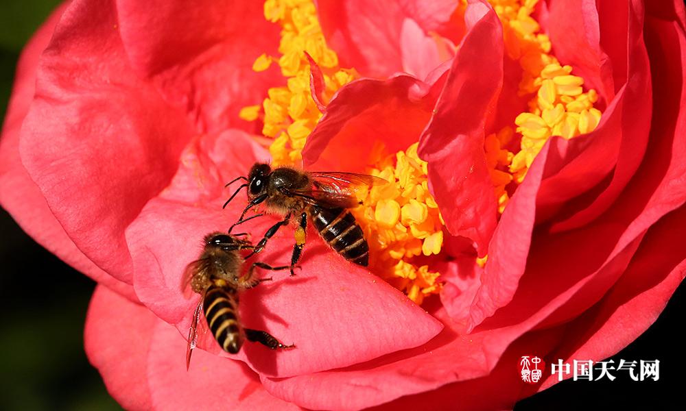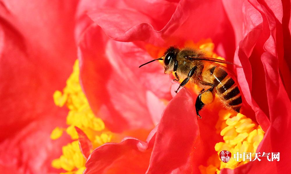 暖阳下,小蜜蜂们在花蕊中采蜜(摄影:刘英轶)
