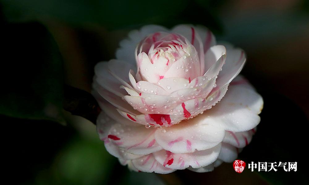 阳光的照射下,茶花上的水珠晶莹剔透(摄影:刘英轶)