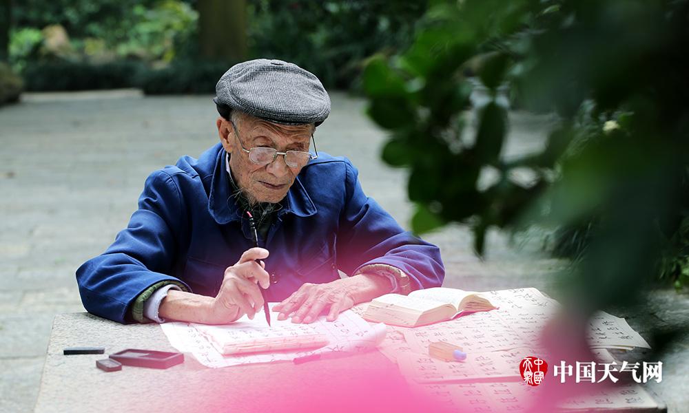 市民在茶花苑里悠闲自得地练习书法(摄影:刘英轶)