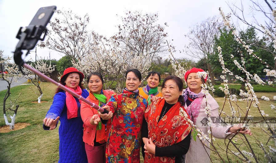 图为市民正在梨花树前自拍留影一幕。广西新闻网通讯员 蓝庆侃 摄