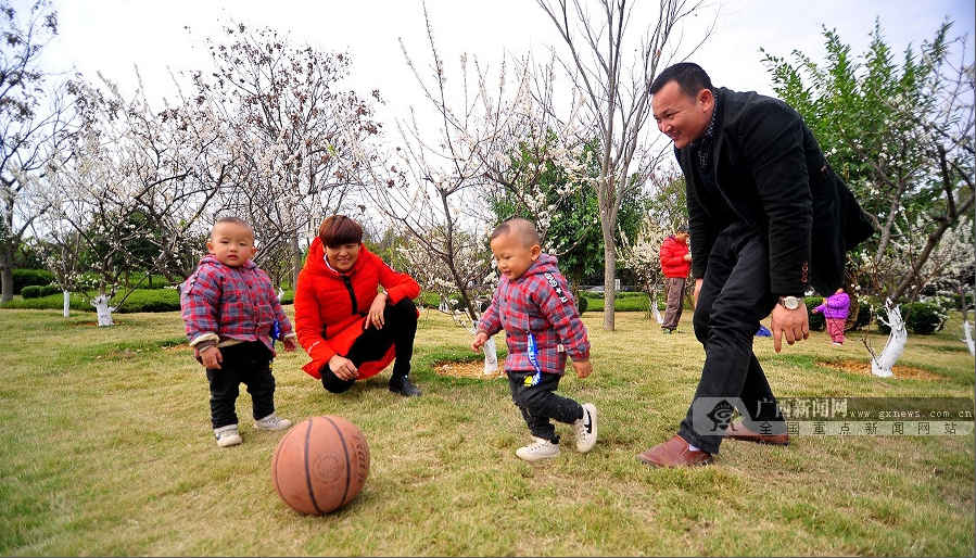 图为一家四口在梨花树下踢球玩乐。广西新闻网通讯员 蓝庆侃 摄