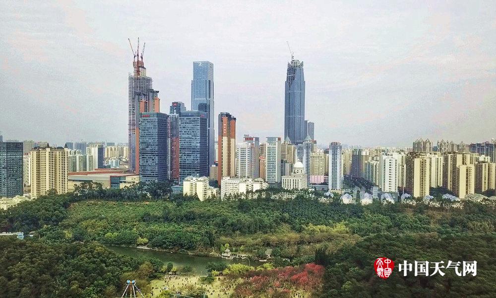 远眺南宁东盟商务区,高楼耸立,似与天空对比高。