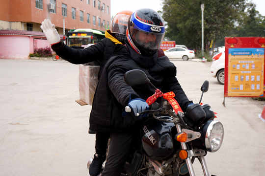 虽然旅途疲累,但想起很快就能回到家乡过年,摩托车手脸上浮起了笑意。(摄影:刘英轶)