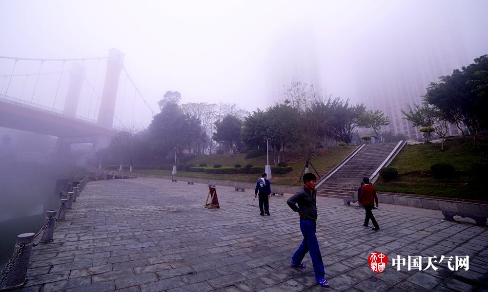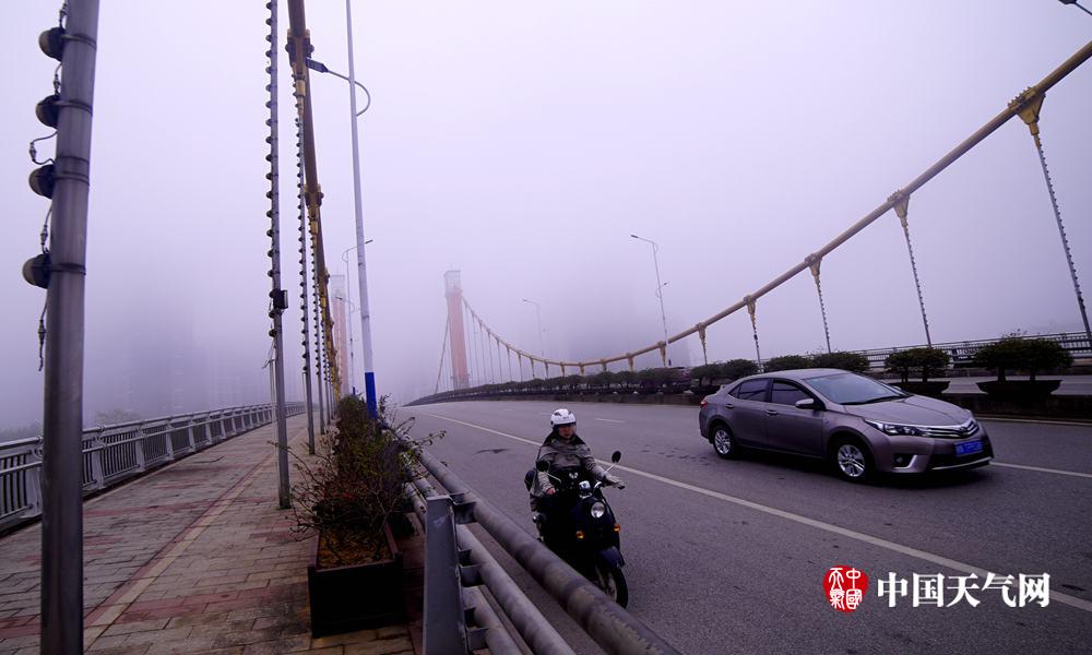 大雾下四桥上,偶尔出行的行人和车辆。(摄影:李斌喜)
