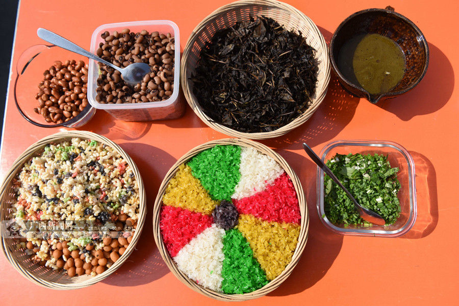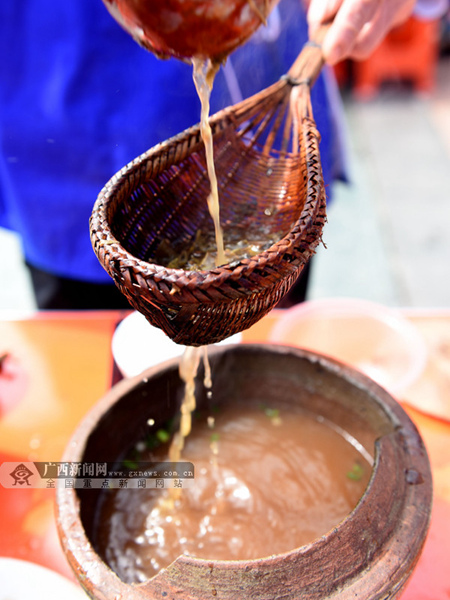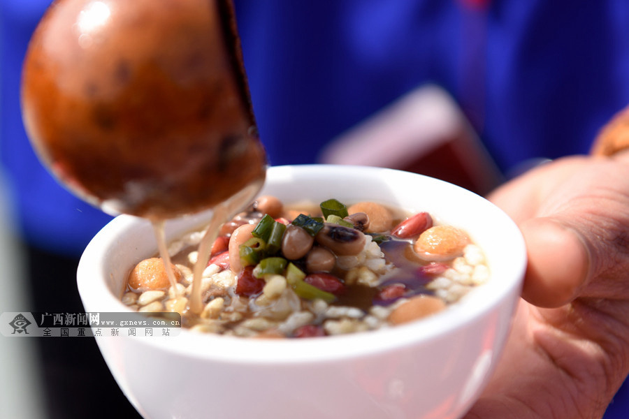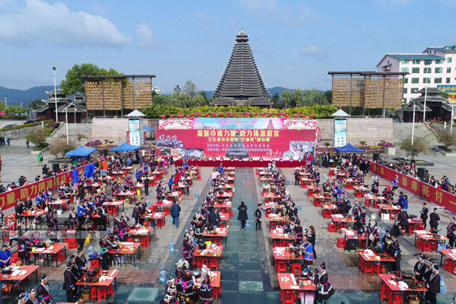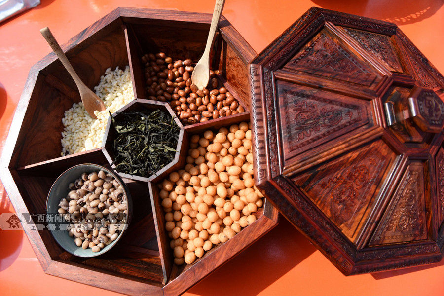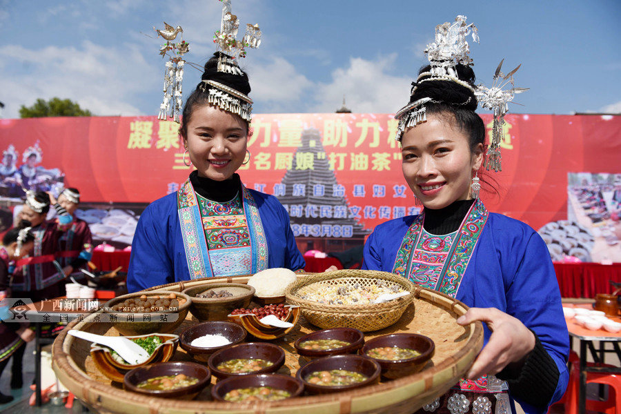 3月8日,柳州市三江侗族自治县举办“凝聚巾帼力量,助力精准脱贫”百名厨娘打油茶擂台赛,200余名妇女身着盛装同台竞技,现场展示侗乡打油茶特色饮食文化。图为参赛选手在打油茶。(摄影:龚普康)