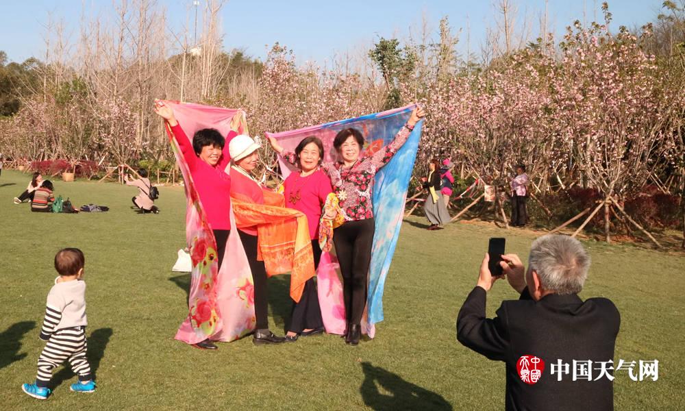 暖阳下,市民与樱花合影留念。(摄影:任乐)