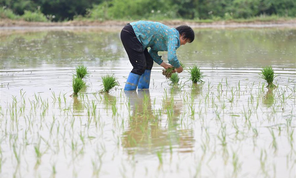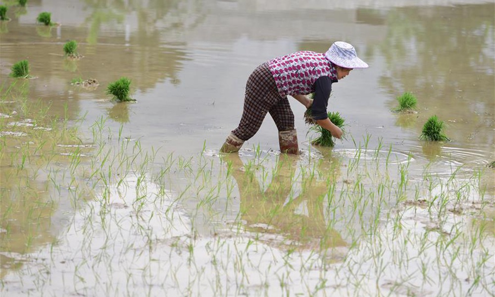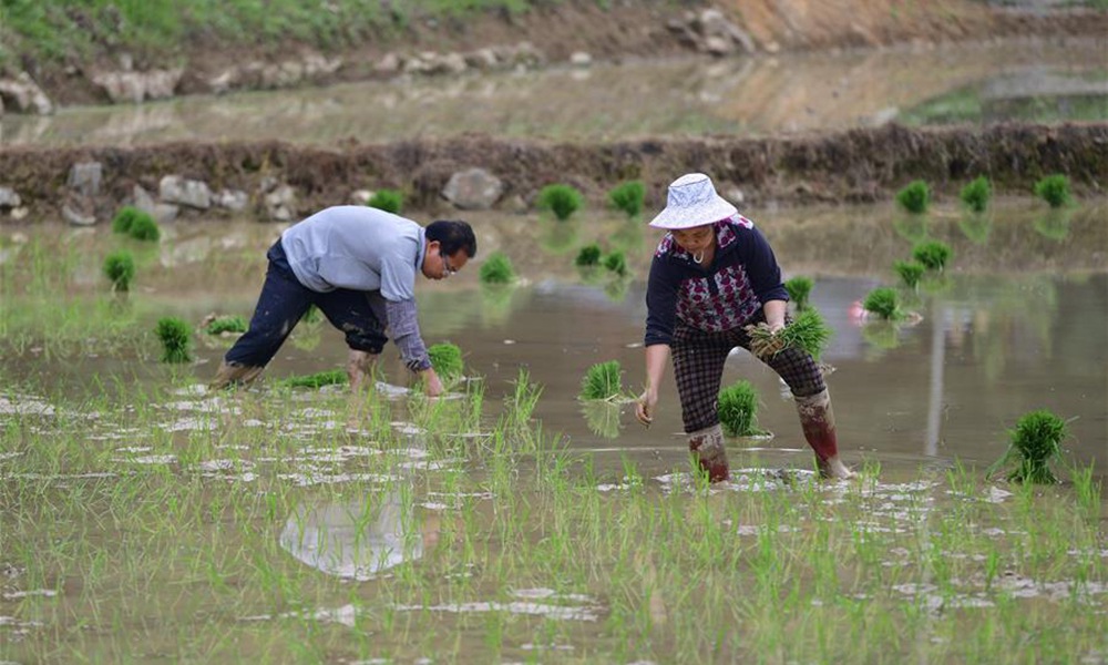 清明时节,气温回暖、雨水渐多,广西各地农民抢抓农时,开展春播春种工作。图为:4月5日,在广西马山县乔利乡乐圩村,村民在田间插秧。(新华社记者 黄孝邦 摄)