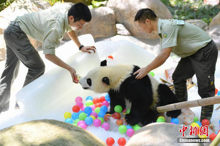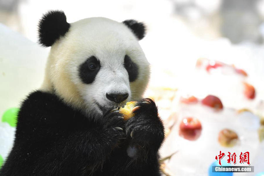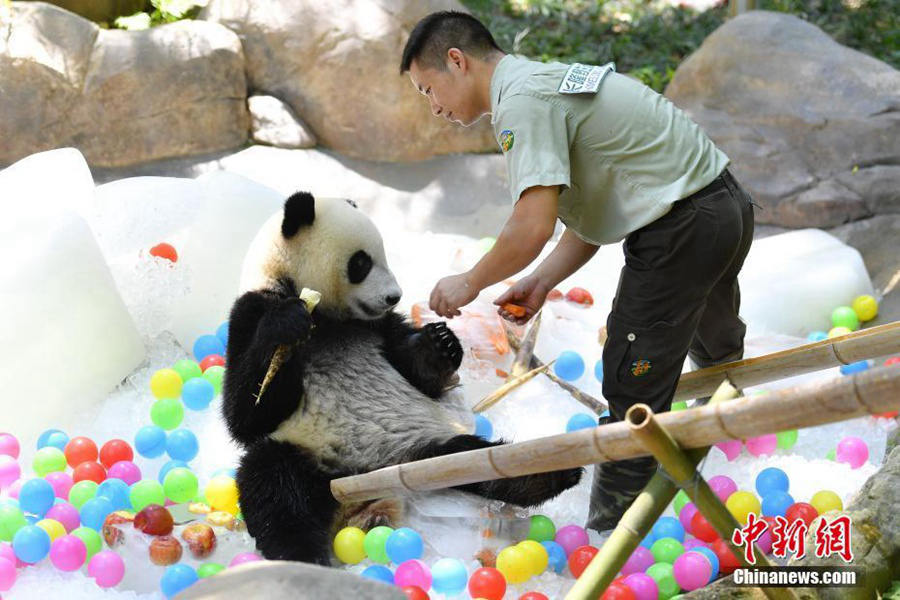 5月28日,生活在广州长隆野生动物世界里的大熊猫吃着冰水果降温消暑。当日,广州最高温度达35℃。 中新社记者 陈骥旻 摄