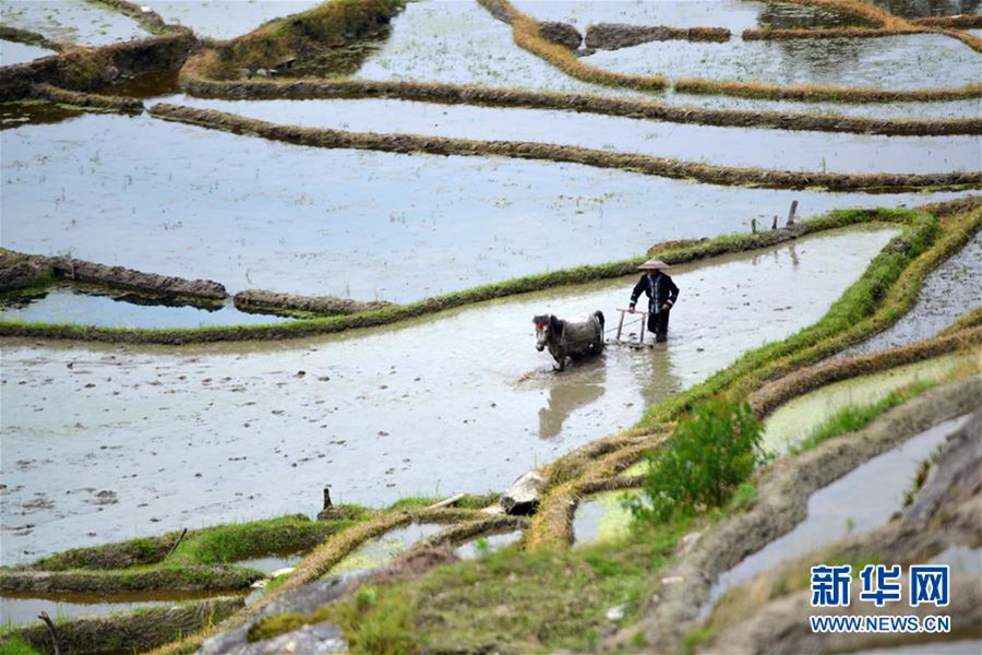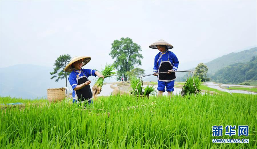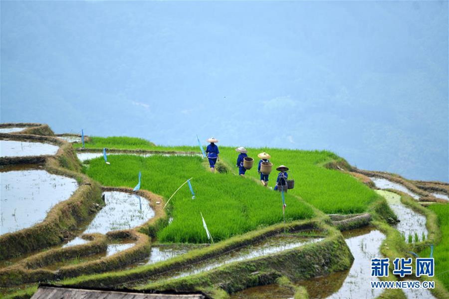 6月16日,农民在广西龙胜各族自治县泗水乡泗水村小岩底梯田里劳作。连日来,广西龙胜各族自治县泗水乡各村寨纷纷进入插秧农忙时节,梯田上一片忙碌的景象。新华社发 潘志祥 摄