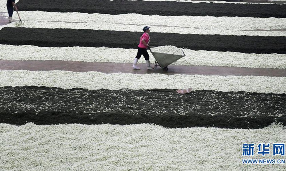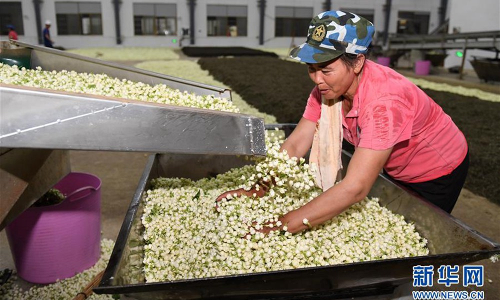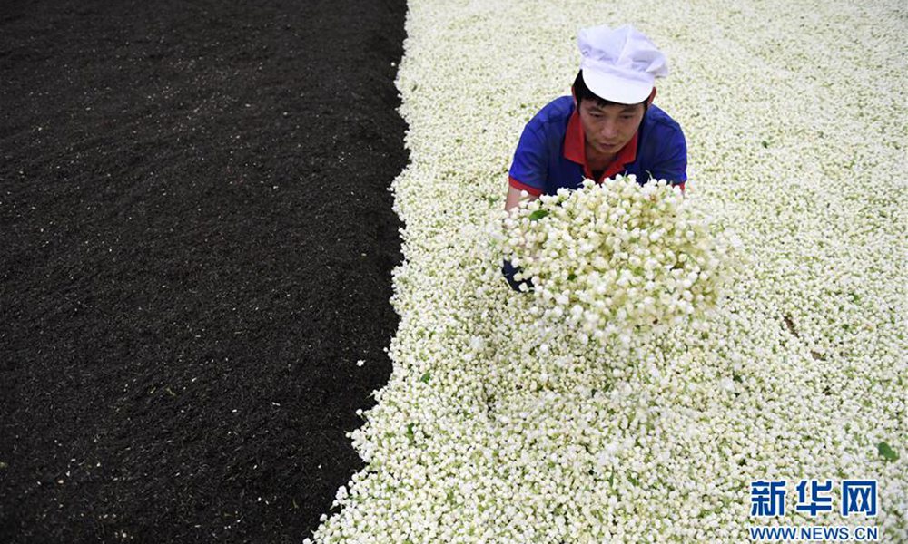 日前,“中国茉莉之乡”广西横县茉莉花全面进入采摘上市期,当地花茶企业抓紧工期将收购回来的茉莉鲜花加工成茉莉花茶。据介绍,横县茉莉花种植面积达10.5万亩,花农约33万人,年产茉莉鲜花8.5万吨,有130多家花茶企业,年产茉莉花茶6.5万吨。图为6月20日,在广西横县一家茶业企业,工人在生产加工茉莉花茶。(摄影:陆波岸)