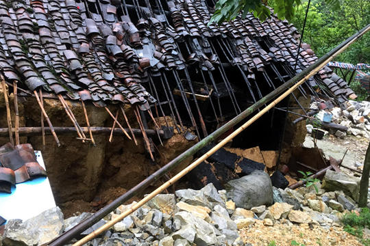 中国天气网广西站讯 昨天(23日)傍晚到今天凌晨,广西田林县出现持续性较强降雨天气过程,并伴有强雷电、短时大风等强对流天气。大部地区过程累计雨量达50毫米以上,局部超过150毫米,降雨量最大的是乐里镇风老村,24小时累积降雨量达到151.3毫米。强降雨造成县城内多处受淹,局地出现次生地质塌陷等地质灾害。暂无人员伤亡数据,具体灾情还在进一步核实统计之中。图为被塌方的泥土淹没的房屋。(图文/周厚霖)