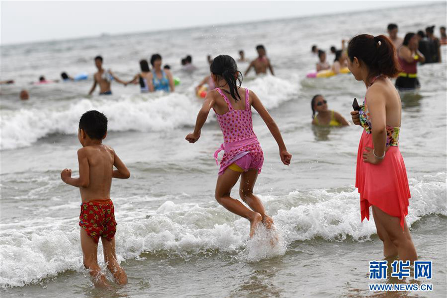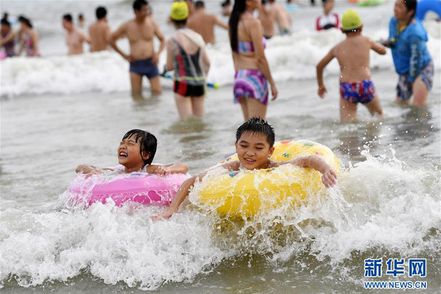 8月4日,在广西北海市银滩,两名小朋友在戏水游玩。当日,广西北海市银滩引来大批游客,大家在这里戏水游玩,快乐消暑。新华社记者 陆波岸 摄